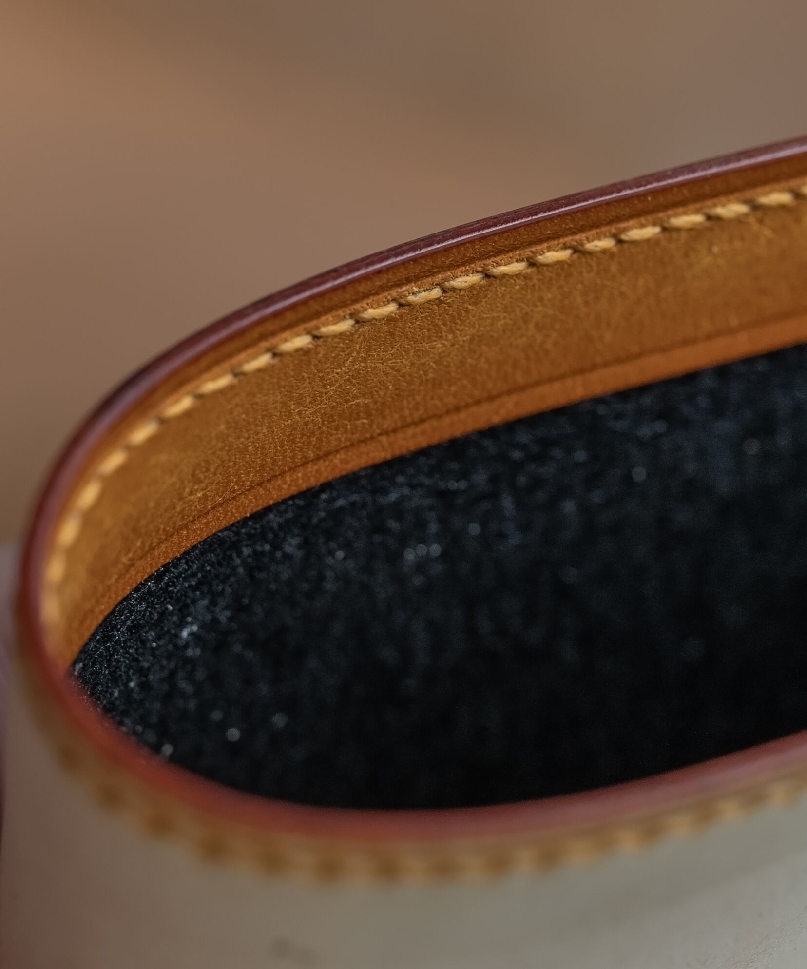 作りは一枚革から型紙を当てがい裁断し、総手縫い仕立てにて、一つ一つ手仕事で製作しています。艶のある断面は、削っては磨きを幾度も繰り返し、自然な染料を乗せ、蝋を刷り込んでいる為、既製品の仕上げとは、見た目も強度も一線を画す完成度になっています。