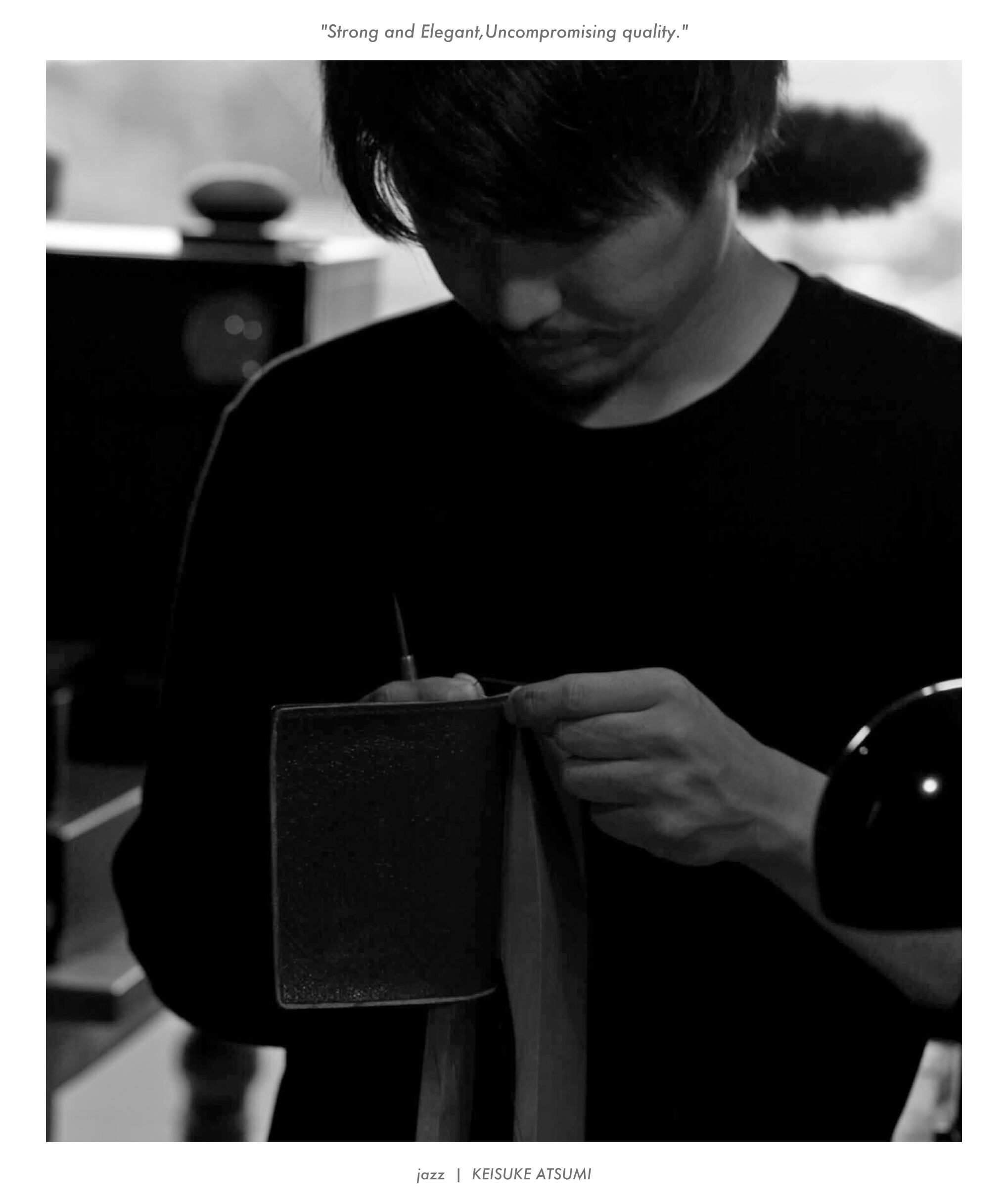 作りは一枚革から型紙を当てがい裁断し、総手縫い仕立てにて、一つ一つ手仕事で製作しています。艶のある断面は、削っては磨きを幾度も繰り返し、自然な染料を乗せ、蝋を刷り込んでいる為、既製品の仕上げとは、見た目も強度も一線を画す完成度になっています。